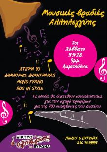 Με αποκλειστικό στόχο την αγορά τροφίμων για τις 700 οικογένειές του, το Δίκτυο Αλληλεγγύης Βύρωνα, διοργανώνει το Σάββατο 5 Μαΐου 2018, 2η Μουσική Βραδιά, στις 9μμ στη Λαμπηδόνα, στο Άλσος της Αγίας Τριάδας.