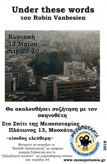 Η Κινηματογραφική Λέσχη Μεσοποταμίας διοργανώνει την Κυριακή, 13 Μαΐου, προβολή της ταινίας "Under These Words (Solidarity Athens, 2016)" (Έγχρωμο, 2018, 52΄), του Robin Vanbiesen, με τους Χρήστο Πασσαλή και Εύη Σαουλίδου. Στην ταινία παρουσιάζονται διαφορετικές δομές αλληλεγγύης της Αττικής. Η προβολή θα γίνει παρουσία του σκηνοθέτη.