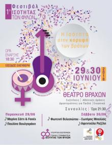 Το 1ο Φεστιβάλ για την Ισότητα των Φύλων συμπεριλαμβάνεται στο Πρόγραμμα του Θεάτρου Βράχων και θα διεξαχθεί με ΔΩΡΕΑΝ είσοδο για όλους και όλες στις 29-30/6/2018 με ώρα έναρξης 18:30.