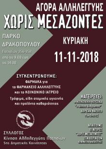 Ξεκινάμε την καινούργια σεζόν με το πρώτο παζάρι την Κυριακή 11 Νοεμβρίου, στο Πάρκο Δρακόπουλου, όπως πάντα, Πατησίων 356-358. Και κάθε μήνα θα διοργανώνουμε μια αγορά αλληλεγγύης, έχοντας πάρει την άδεια του δήμου της Αθήνας, γιατί το όπλο των ανθρώπων είναι η αλληλεγγύη. Σας περιμένουμε όλους.
