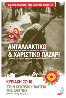 Ανταλακτικό & Χαριστικό Παζάρι Sunday, 27 October, 2013 - 11:00Ανταλακτικό & Χαριστικό Παζάρι απο όλους για όλους Tags: ΑνταλλακτικόΠαζάριSHARE IT: Tweet Συνδεσμοι: http://da-dy.blogspot.com/2013/10/blog-post_26.html CONTACT INFORMATION Κεντρική πλατεία Δάφνης Δήμος Δάφνης-Υμηττού
